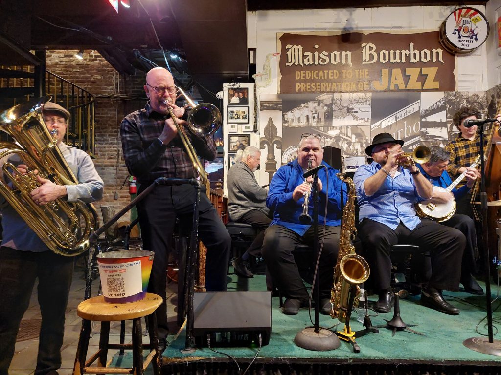 Fritzel’s European Jazz Pub is our go-to spot for daily music and we start out there after securing our hotel room and barely unpacking. It is always a pleasure to hear Colin Myers (tb), Dizzy Incirlioglu (wash), Ellis Dyson (gtr) and Zach Lange (this time on bass!) followed by Jamil Sharif (tp), Chuck Brackman (bs/tp/gtr/sousa), Leslie Martin (p), Stephen Tenney (tb) and Bryan Besse (dr). A great beginning to several weeks of similar musical adventures! A stop at Maison Bourbon on the way back to the hotel had Danny Rubio (p/tuba/sousa), Jeff Kreis (tp), Joe Cea (p), Ryan Burrage (reeds) and Sean Clark (dr) in rare form. Pam Murphy (v), a recent California transplant, has a bright delivery and a delightful interpretation to many songs. Both her dad and mom were musicians and well-known in our favorite genre. Her mom is still belting them out at 95!
