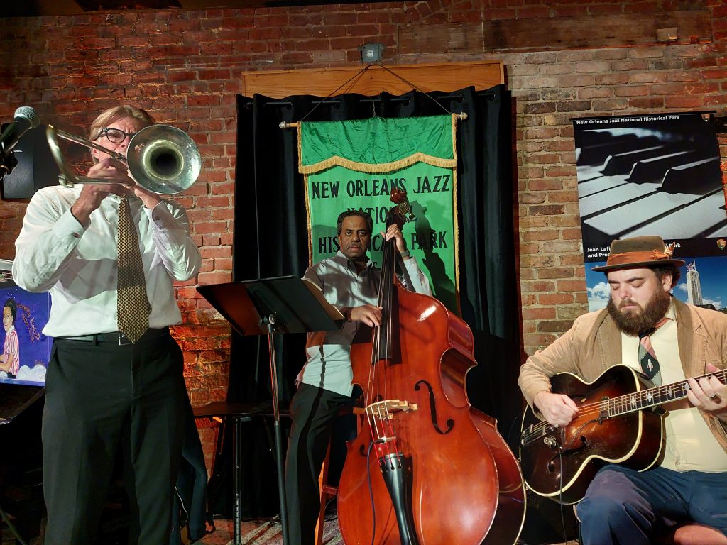 The New Orleans Jazz National Historical Park has daily lectures and performances except on Mondays. We often attend several events during any visit and the first one had Craig Klein (tb), Mark Brooks (bs) and Hunter Burgamy (bj/gtr). Craig talked about “collective improvisation” so prevalent in traditional jazz. The trumpet often plays the melody, the trombone featuring glissandos and growls and the clarinet play around the melody. This is the “front line” I love so dearly. The drums and rhythm section keep the time and play “on top” – they keep the time, not establish it.