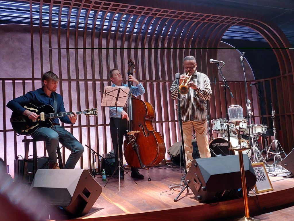 The Omni Royal Hotel opened up a new jazz club, The Three Maries—and we hustled over to see Leroy Jones’ trio with Mike Clement (gtr) and Jason Stewart (bs). This new venue for the French Quarter is large and exudes sophistication and a luxurious ambiance. Several bands play on the weekends and it was fun to see Leroy in such a different setting. We made plans to visit with him the next day at Preservation Hall.