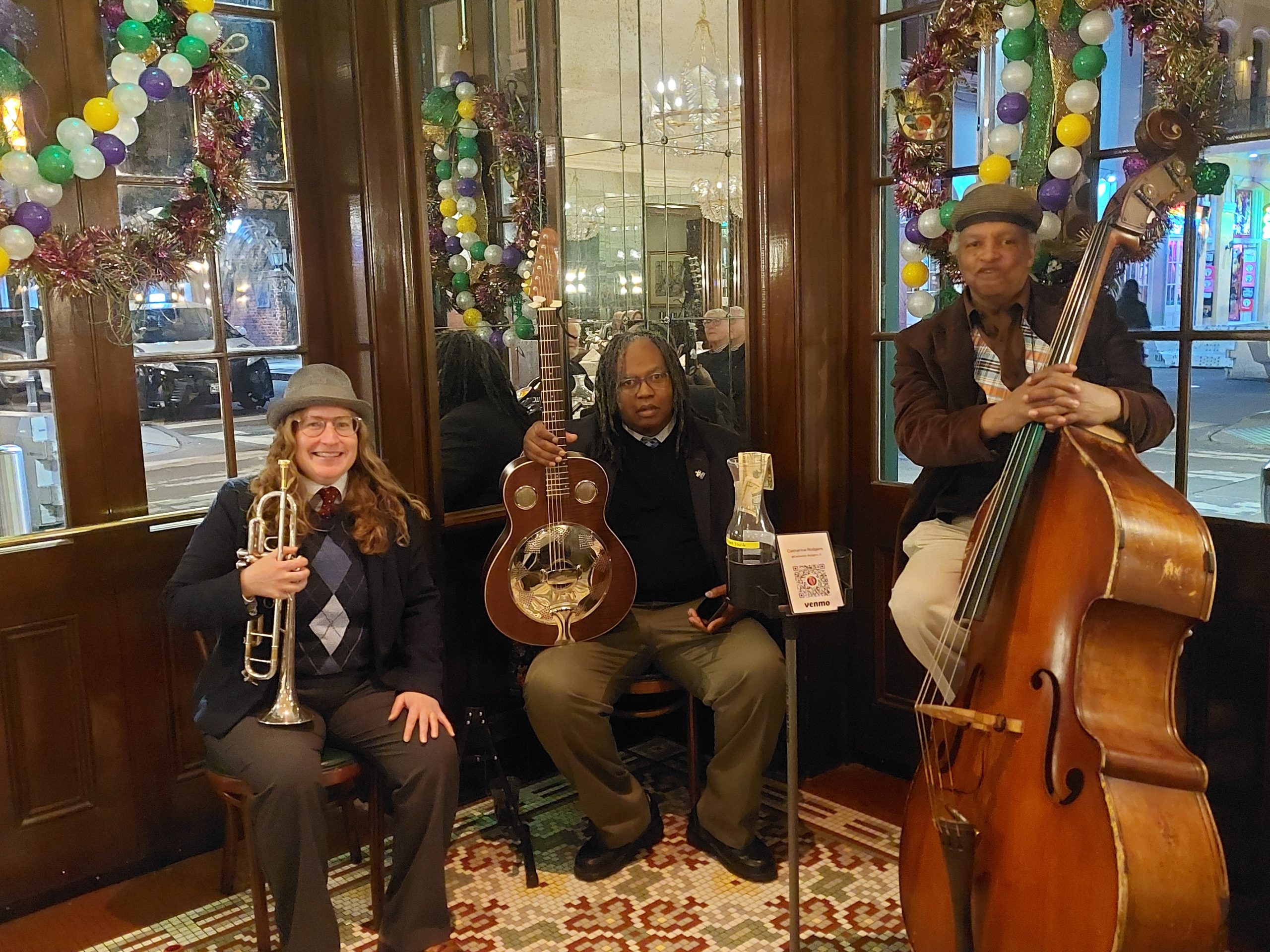 With a delay in our returning flight we spent the last evening with friends for dinner at Arnaud’s famous restaurant in the Jazz Bistro to hear Catie Rodgers (tp), Eric Robbins (gtr) and Sugar Bear Francis (bs). A terrific way to spend our last night and then a quick run-in to the Maison Bourbon to say a final farewell to those musicians too – all in all a fantastic visit All Because It’s Carnival Time!