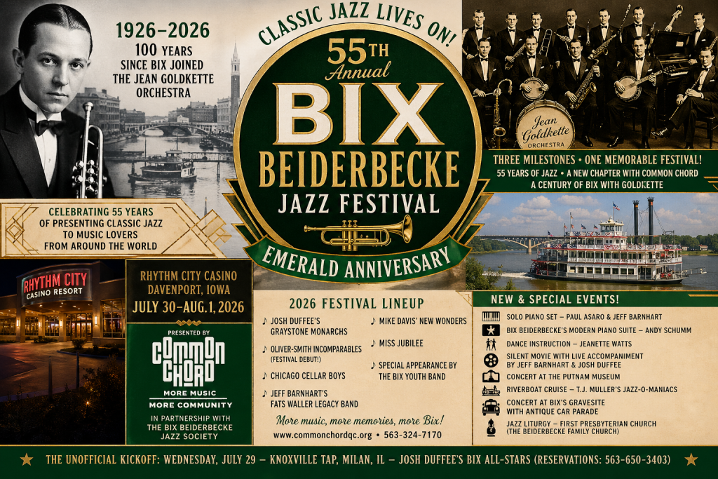 In 2026, the Bix Beiderbecke Jazz Festival celebrates three important events: The Emerald Anniversary (55 years of presenting classic jazz to music lovers from around the world); First event hosted by Common Chord since the organization’s merger with the Bix Beiderbecke Jazz Society; and the Centennial of Bix Beiderbecke joining the Jean Goldkette Orchestra.