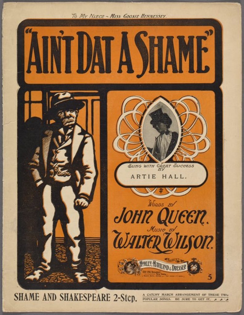 Just a few months later came, “Ain’t Dat a Shame,” credited to composer Walter Wilson and lyricist John Queen. Not only was it one of the biggest hits of 1901, but it also happened to be a 12-bar blues song. Pretty much every performer who made records at the time recorded it. Because of this, there are so many variations on the accompaniment to be heard. Not only was it popular on recordings, it was also popular in sheet music. The sheet music for the piece continues to show up regularly, over 120 years later. Not only did singers record the piece, but bands and orchestras as well, including Hager’s orchestra.