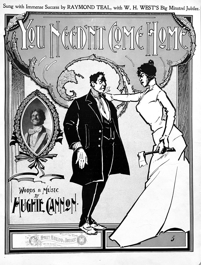 Things get really interesting in 1901 with several 12-bar blues songs. The first 12-bar blues song to be published was “You Needn’t Come Home” by Hughie Cannon. Cannon continued to write many songs with 12-bar verses, but this was his first one. It is an obscure song today, but it was just popular enough at the time to be recorded for one label at the least. Unsurprisingly, Arthur Collins was the one who recorded it, and he did it for Zon-O-Phone. At the time Zon-O-phone was a relatively small label, and often recorded more obscure songs than other labels. You can often find the only period recordings of some pieces on Zon-O-Phone. It is honestly quite remarkable to hear such an overt blues song so early on record, and an obscure one at that. The accompaniment on it also adds to the amount of blue notes in the original sheet music.
