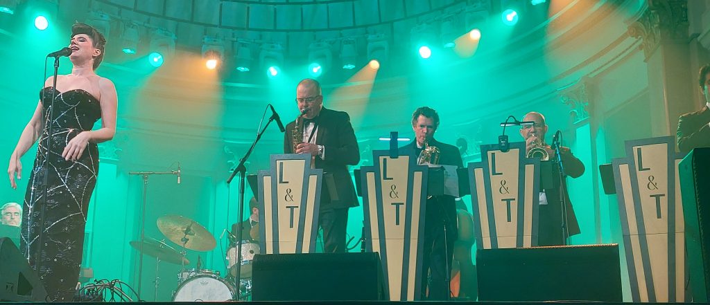 The acoustics were terrific and the outdoor areas were now converted to a veranda bar with some “small bites” available. The elevated stage allowed for good viewing and Lizzy had a few of her regular band members on tour including Chris Dawson (p), Nate Ketner (reeds), and Sam Rocha (bs). Local musicians Jason Carder (tp) and Nick Coventry (vln) also joined the 8 piece band and fit in nicely with the theme. Besides some of her own compositions, Lizzy specializes in the 1930s big band/swing era and has an outstanding collection of appropriate dresses with a flare to match!