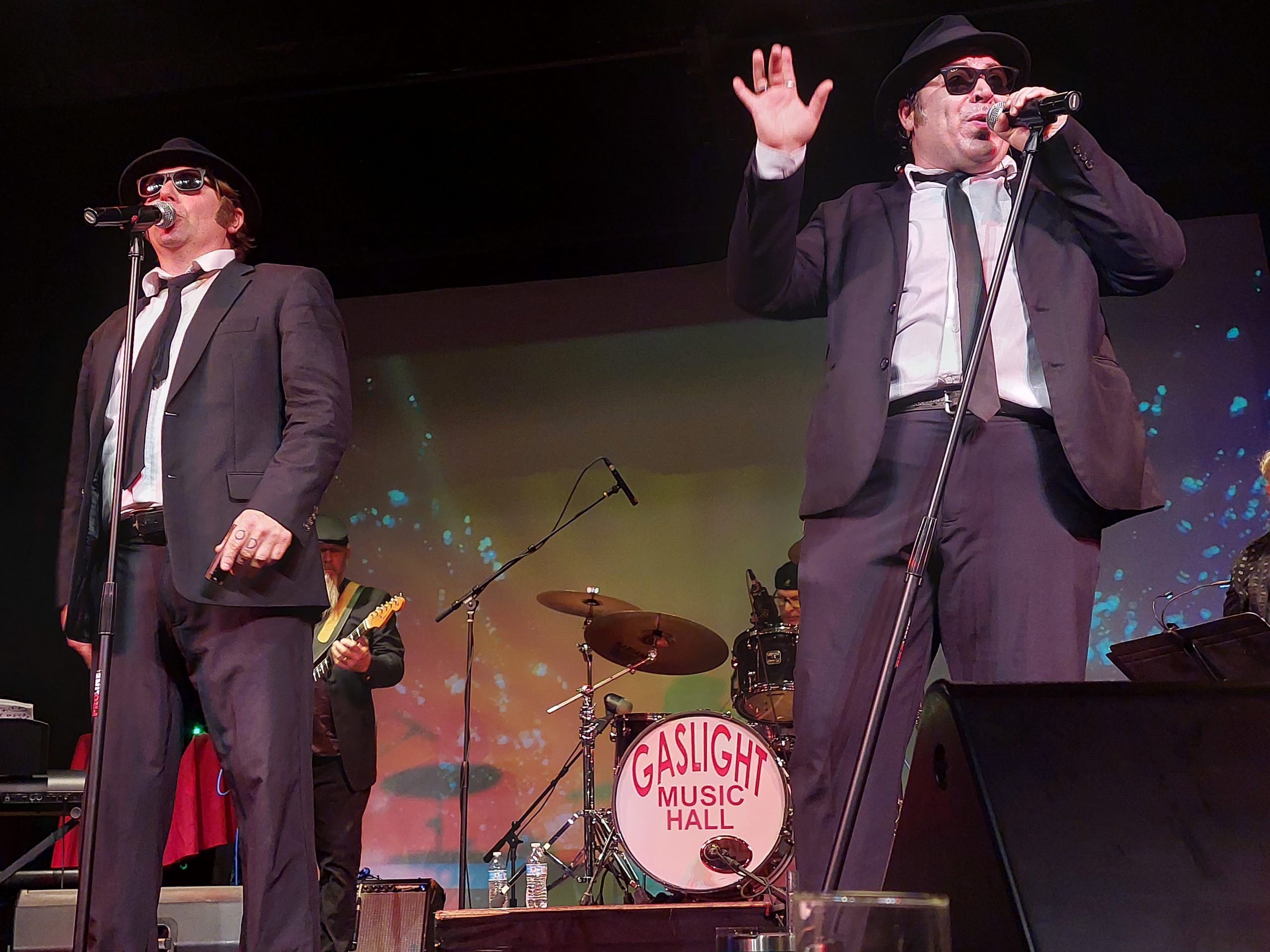 Another evening at the Gaslight Music Hall brought a tribute to the Blues Brothers with regular Gaslight performers Charlie Hall and Mike Yarema. With members of the local Bad News Blues Band that included Tucson favorite Hurricane Carla Brownlee on a baritone sax and Ric Peron (tp), they started playing while the Blues Brothers made their entrance and Charlie (as Jake) and Mike (as Ellwood) cartwheeled onto the stage.