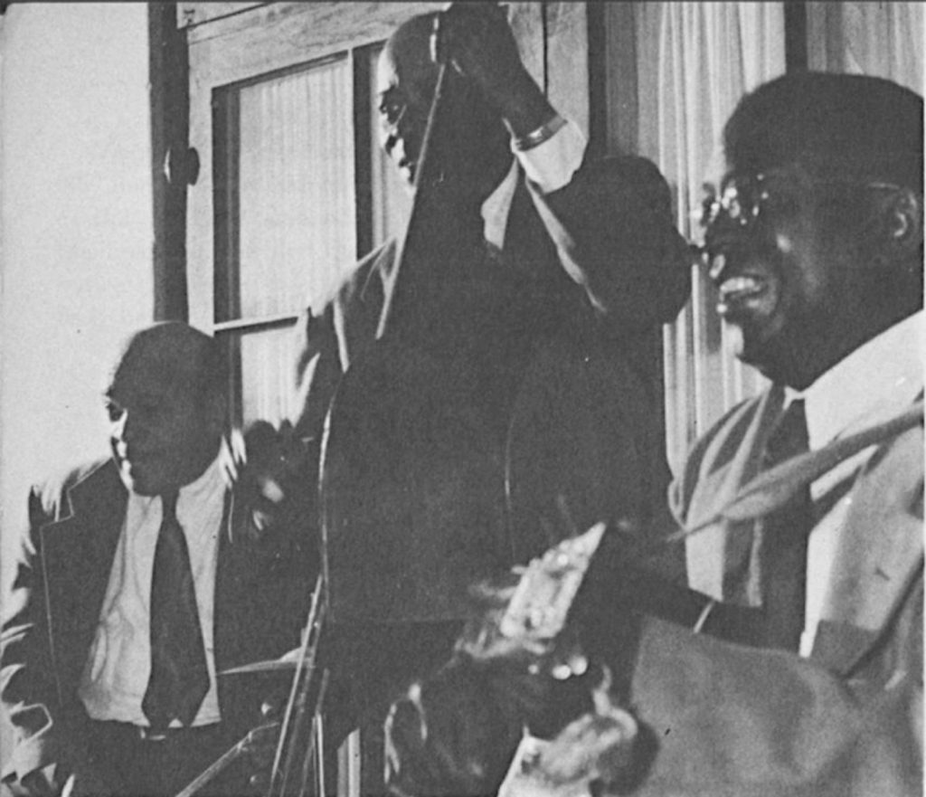 Helen Andrews stayed on to sing one more number: a duet with Bud on “Joshua Fit De Battle Ob Jericho.” The performance starts with an otherworldly muted cadenza by Papa Mutt, a tom-tom pickup to tempo, and an ensemble chorus with a clarinet bridge. The vocal, with Bigard and Wilson providing terrific accompaniment, is a joy to hear. Bigard plays a great solo—as usual—followed by Ory, using his Magin & Mayer “Saxonette” mute and backed by Minor Hall’s afterbeats on the snare drum. He keeps the afterbeat going through two more choruses, with Papa Mutt’s ghostly vibrato prominent in the ensemble.