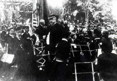 Patrick Gilmore was born in Ireland in 1829. He did not move to the United States until 1849, but not without making a local name for himself. In his home village he has already begun his own small band. His music teacher Patrick Keating was impressed by his ambition with this band of his, and encouraged him to move to the United States. It took him a little while to make a name for himself in Massachusetts, where he settled. He started off in Salem, playing in small time local bands and making extra money playing bones and tambourine in a minstrel troupe. By 1857, he had become such a well-known figure with a good band to where his band was contracted to play for the parade of James Buchanan’s inauguration. Until the beginning of the Civil War his band continued to play for various political functions in Boston and around Massachusetts.