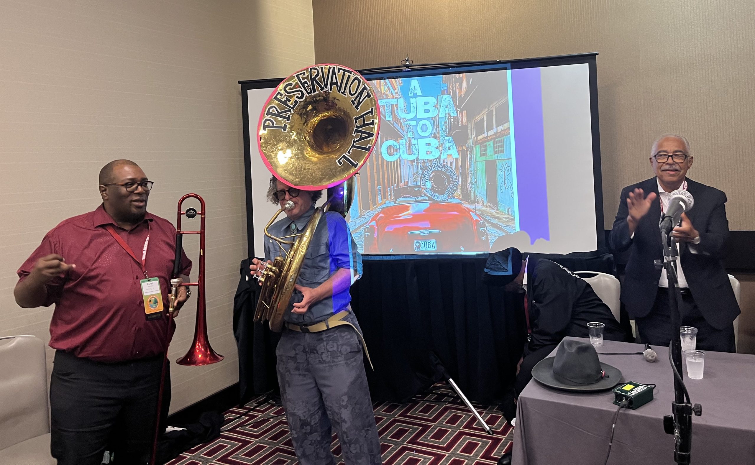 Preservation Hall, in fact, was a major sponsor of the conference, and had a strong presence throughout the four-day event. Another day, an assemblage of Hall old-timers did an evening performance of traditional repertoire, and various musicians from the Hall’s roster did two other sessions as well. One of these consisted of a panel of the Cuba trip participants very movingly describing that life-changing experience, now documented in the film A Tuba to Cuba. Another found a group of Hall players demonstrating and discussing modern brass band repertoire, joined by a bevy of student musicians (quite to the delight of the audience).