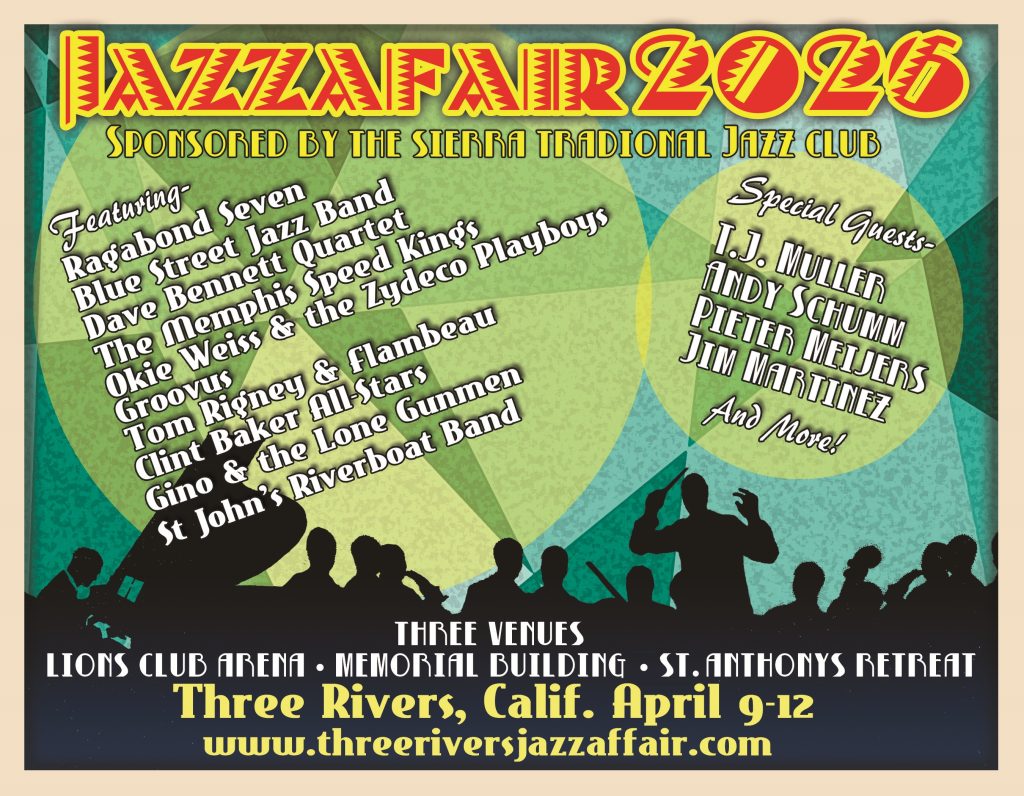 Visit the Sierra Traditional Jazz Club online to order tickets. www.threeriversjazzaffair.com Early bird discounted three-day badge available until March 15.