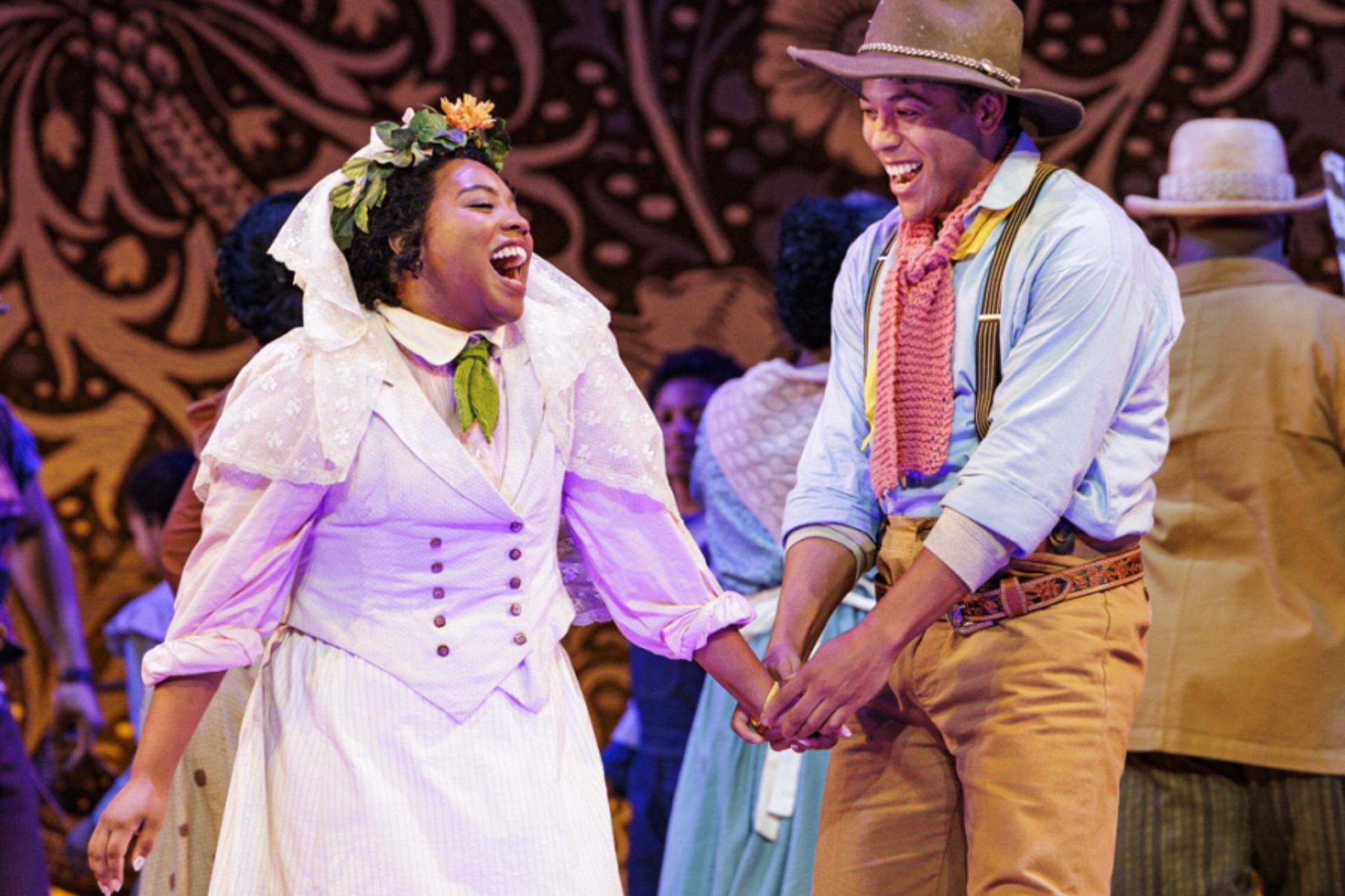 During the Overture, a choreographed mini-ballet enacted the discovery of Treemonisha by a tree. She is schooled, learning to read and write, before being reunited with her adoptive parents, Monisha and Ned, as a young woman. We are also introduced to Zodzetrick selling his bags of tricks to workers who are returning home from the fields. The Overture unexpectedly segued directly into “Aunt Dinah Has Blowed De Horn”; a number that originally closed out Act Two in the original Joplin opera. In past productions, this brought the house down and caused audience participation with rowdy hand clapping. However, with this redirected placement, the number came and went without much notice.